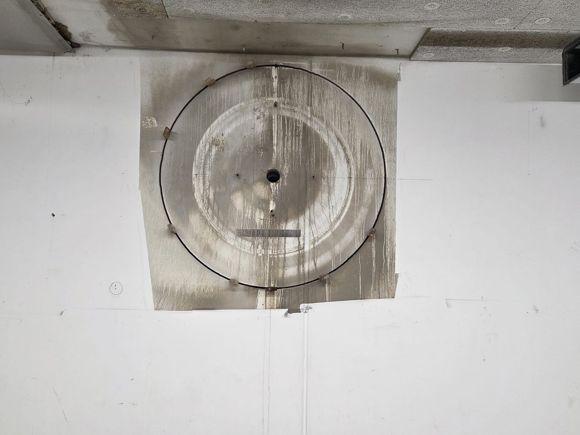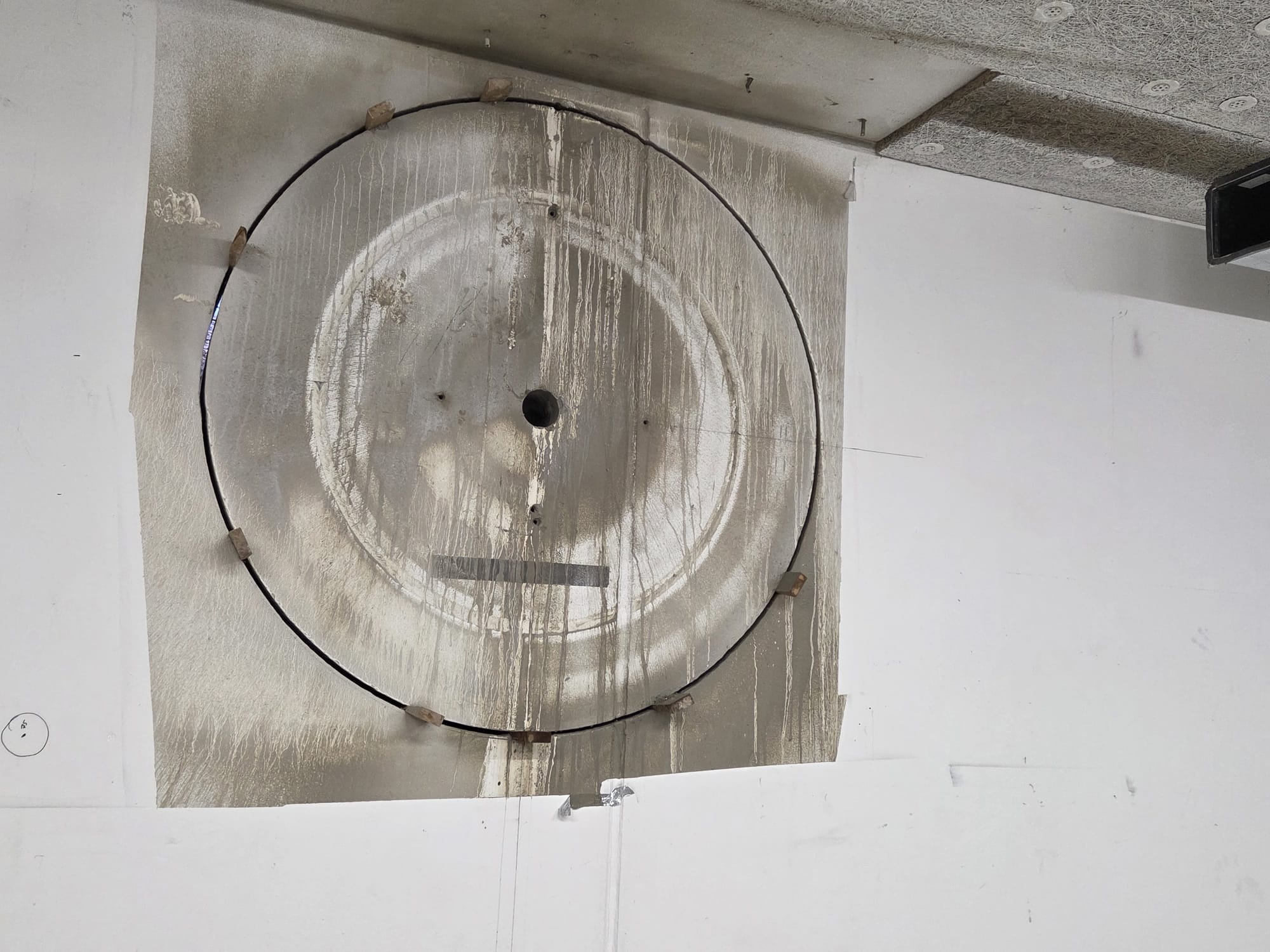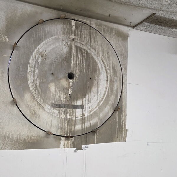 Anfertigung einer kreisförmigen Öffnung (Ø 1,5 m, Tiefe 80 cm) als Vorbereitung für den Einbau einer Schleuse zum Druckausgleich. Der Schnitt wurde mit der Zirkelsäge von beiden Seiten ausgeführt.